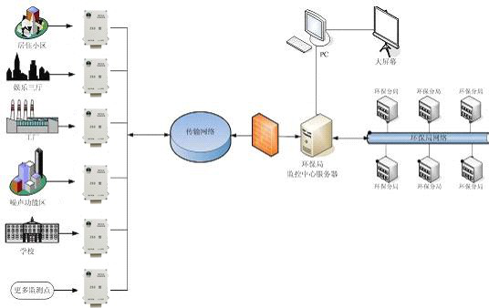 客户需要在监测辖区内的工地实现远程的噪声监测预警,测点分别布置于工地内重要的位置,然后通过终端远程传输设备接入到 Internet 网络。各个工地需要同时监测,全部接入到服务器机房,客户端采用 web 网页方式实施管理和查询,达到实时监控与指挥的目的。