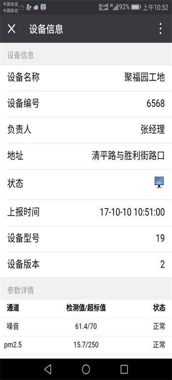 自动监测采集点将监测数据和采集设备运行情况、现场环保数据的实时采集,通过网络传输到监控中心。监控中心服务器装有服务器端软件,结合噪声排放单位信息库、噪声投诉等,对接收的现场噪声数据进行存储、分析、显示。出于对信息安全、科学管理的需要,给有数据访问需求的部门或人员配置访问数据的不同用户名和权限,用户可实时查看并配置监测到的现场环保数据。另一方面, 现场检测的噪声数据通过智能终端内部的程序设定可以直接发送到排放单位环保责任人和环保执法人员的移动电话上,通过这种主动的方式实现随时随地汇报现场噪声信息。有力控制噪声的违规排放事件的发生,达到净化城市声环境的目的。